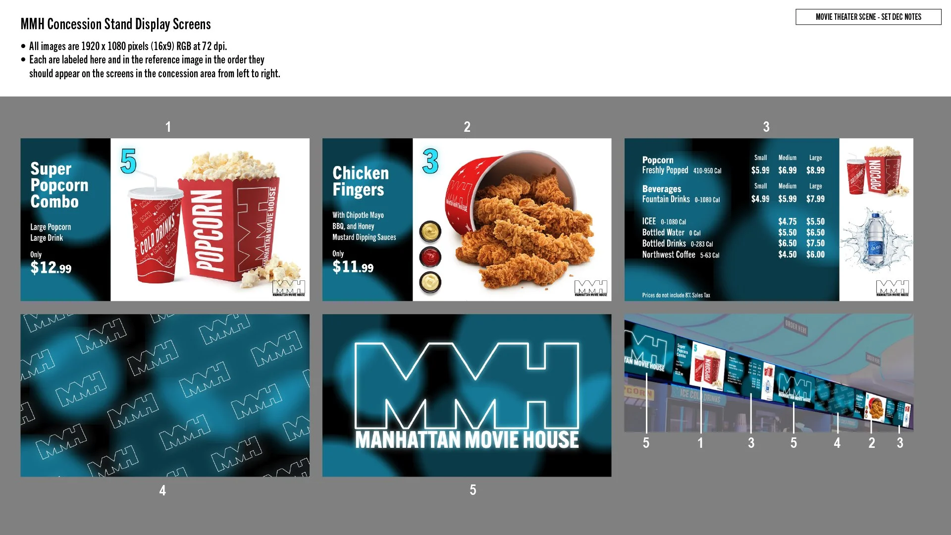 The last stage of the exam process was to create a logo, set dec and prop elements to make the set of “Manhattan Movie House” complete, given only this photo and the name. In addition to the pre-visualization below, I created a logo and branding for the theater, movie posters, a drink cup, a ticket, and ordering screens. I included labeled set dec and props notes with details about all the elements.